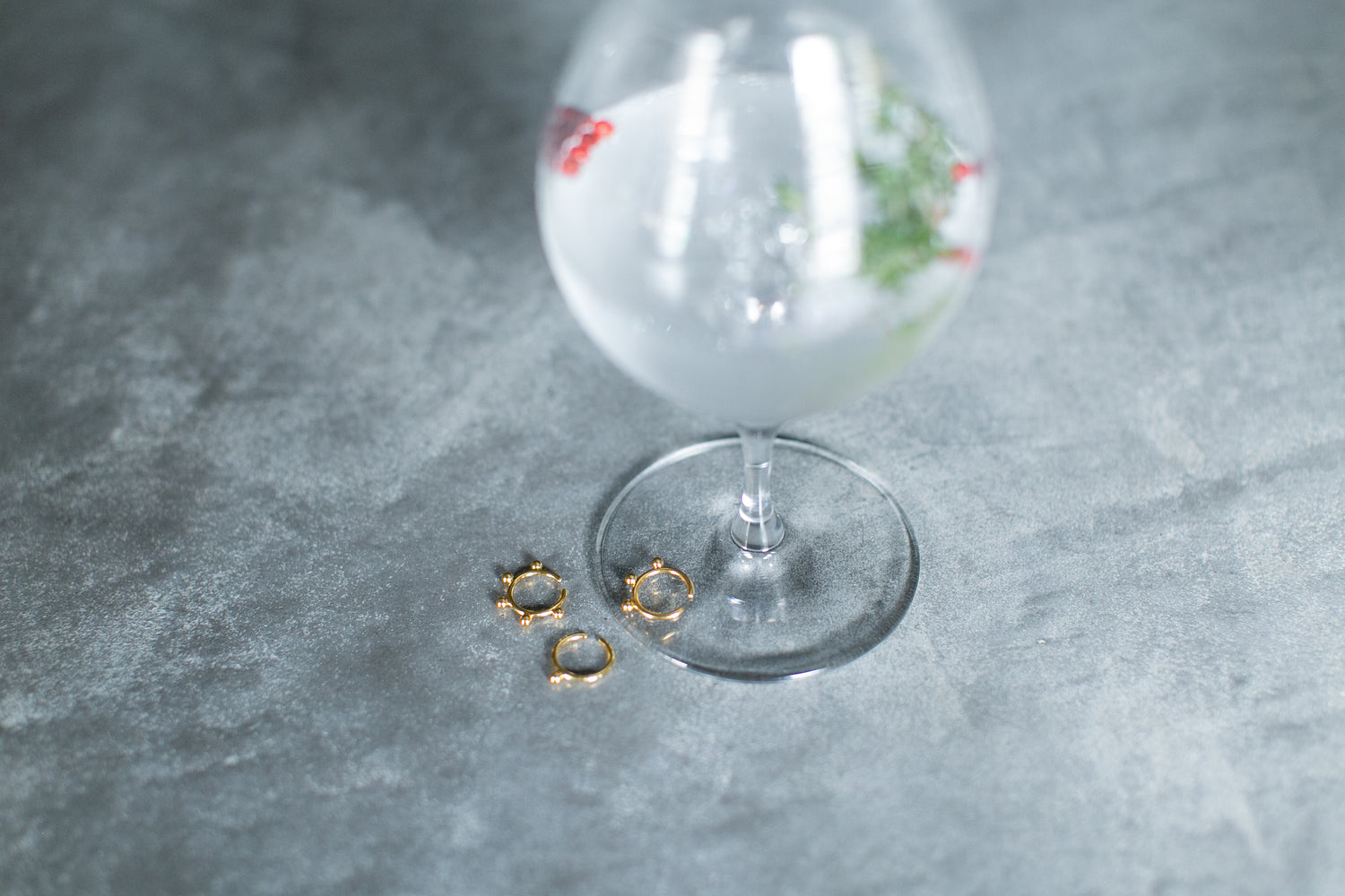 10種類のボタニカルを使っているジン ”ELEGANT” の香りをシンプルに引き立たせた定番カクテル”Gin and Tonic”は、数個のボールがモチーフになっているセルクルカフやポワンリングと重なり、どちらも華やかでありながらすっきりした印象。