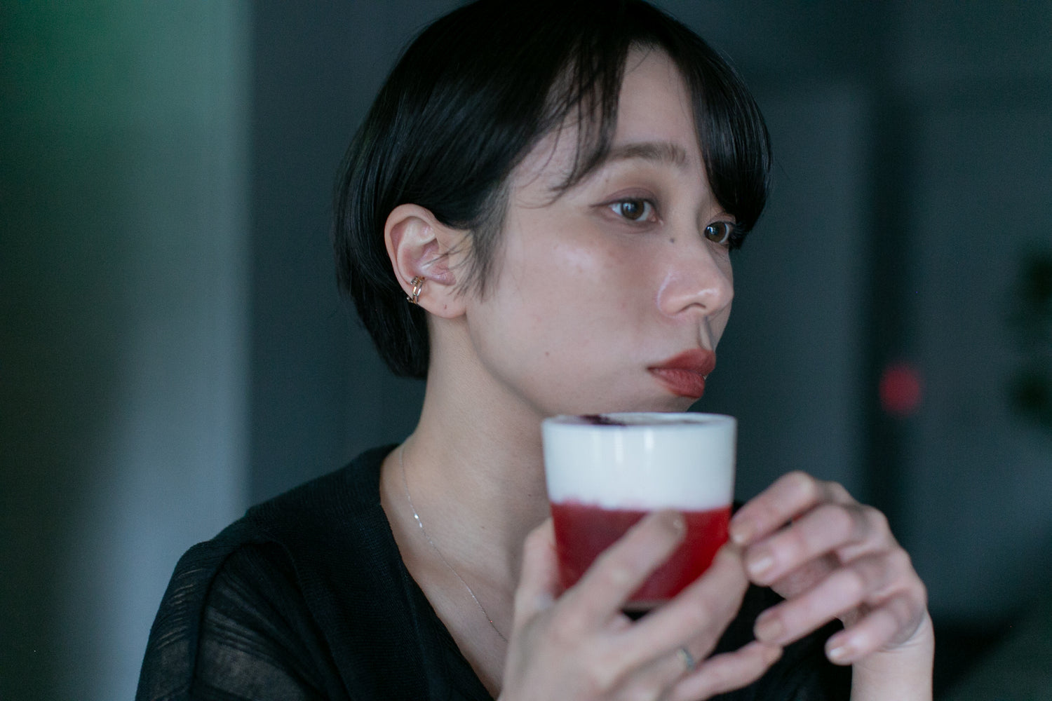 自家製のラズベリーシュラブでフルーティーさがアクセントになり、ひよこ豆の煮汁であるアクアファバで雲を表現しつつ、甘味と酸味のバランスが心地よい”Cloudy Gin Sour”は、コートシリーズやメランジュシリーズがもつ視覚的に直線的な印象と、テーマがもつ曖昧さをまさに体現している。